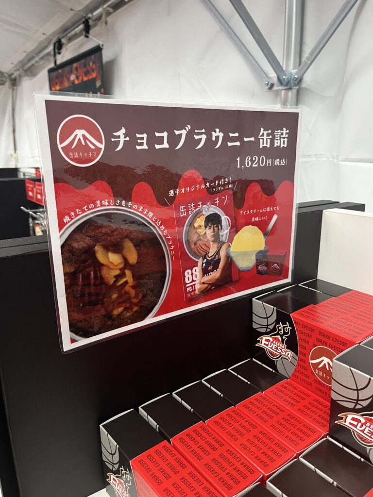 中身は弊社NB商品のチョコブラウニー。さらに、缶の中には大阪エヴェッサの選手カードを1枚封入し、